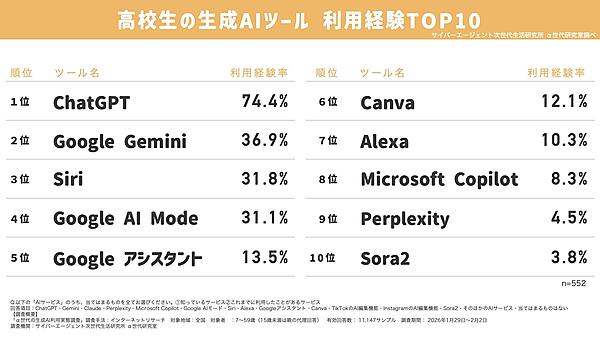 中学生・高校生の生成AI利用率ランキングTOP10