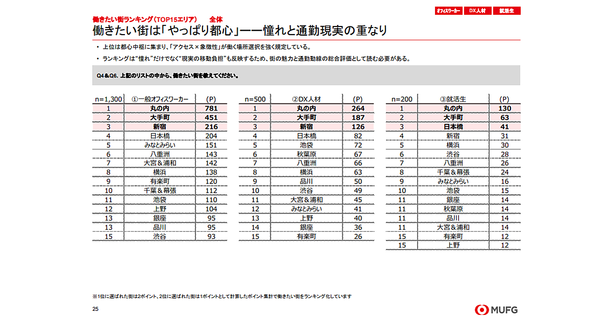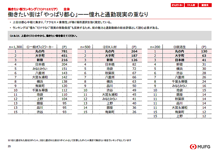 「働きたい街ランキング」によると、オフィスワーカー、DX人材、就活生のいずれも1位は「丸の内」となった。2位は「大手町」、3位には「新宿」や「日本橋」が入り、都心のビジネス街が上位に並ぶ結果となった。