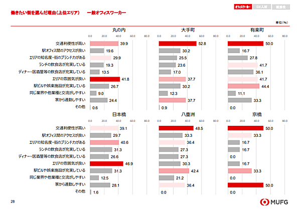 働きたい街を選んだ理由を見ると、丸の内や日本橋、みなとみらいは「エリアの雰囲気がいい」がトップに。一方で、大手町や八重洲、新宿は「交通利便性が高い」に票が集まっており、池袋、横浜、大宮&浦和、千葉&幕張は「家から通勤しやすい」が圧倒的に多かった。