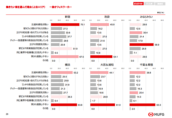 オフィスワーカーでは、5位以降も「みなとみらい」「大宮&浦和」など交通利便性の高いエリアがランクイン。DX人材でも「池袋」「秋葉原」などの都心部が続いた。また、就活生では「渋谷」「横浜」といった華やかなイメージの街も支持を集めていた。