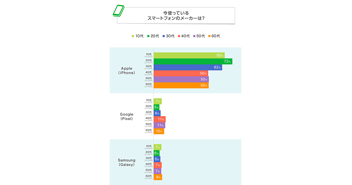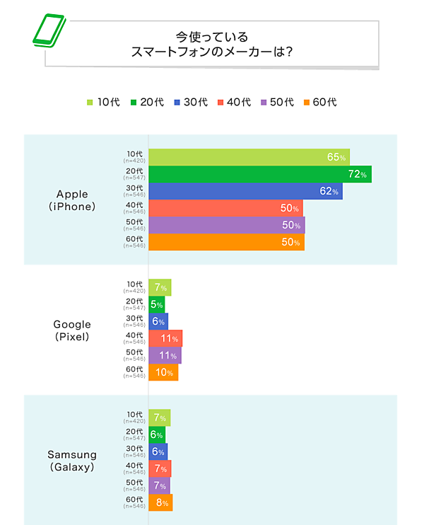 調査によると、今使っているスマートフォンのメーカー1位は全年代で「Apple(iPhone)」となった。全体の2位は「Google(Pixel)」で、以下「Samsung(Galaxy)」「Sony(Xperia)」「Sharp(AQUOS)」などが続いている。