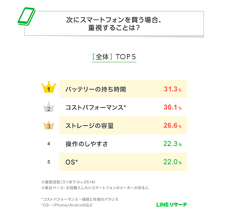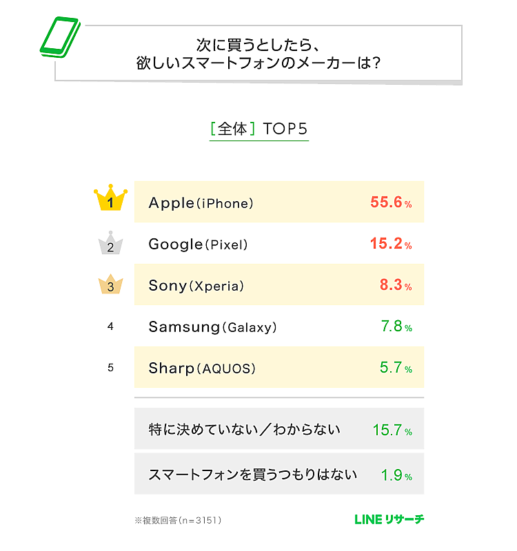 LINEリサーチは、「今使っているスマートフォンのメーカー」に関する調査を実施した。次に購入したいスマホのメーカーや、購入時に重視するポイントを含め、15~69歳の男女3,151名を対象に調査している。