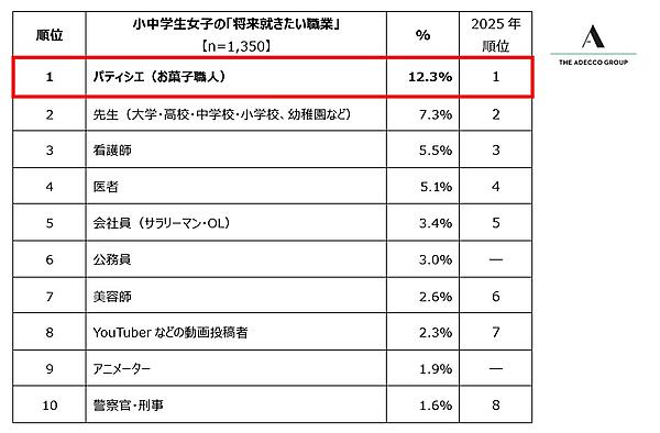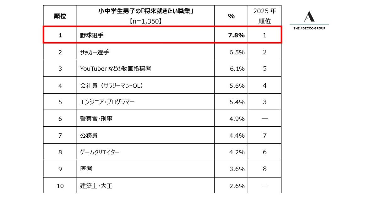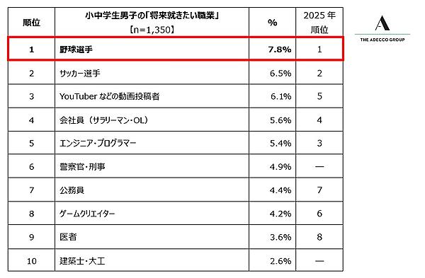 アデコは、全国の小中学生を対象にした「将来就きたい職業」と「憧れの人」に関する調査結果を発表した。2,700人(男子1350人・女子1350人)の小中学生が回答。「将来就きたい職業」は単一選択式、「憧れの人」は単一自由回答式となっている。