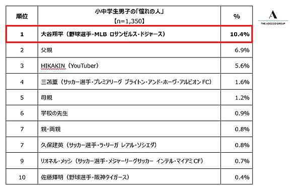 また「あなたの憧れの人は誰ですか?」と聞くと、男子の1位は「大谷翔平」10.4%、女子の1位は「母親」9.8%だった。男子では「父親」6.9%、「HIKAKIN」5.6%が大谷に続く。また複数のスポーツ選手がランクインしている。
