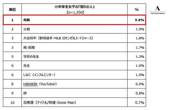 一方女子は身近な存在である母親に「父親」1.9%が並ぶが数値にはかなりの差がある。また「大谷翔平」が、女子の「憧れの人」3位にもランクインしている。