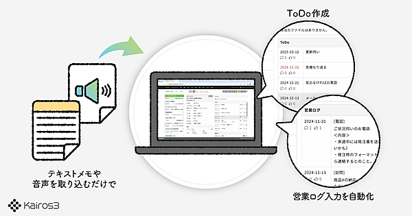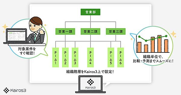 営業・マーケティング支援ツール開発・提供のカイロスマーケティングは、同社が展開するMA(マーケティングオートメーション)とSFA(営業支援システム)の一体型ツール「Kairos3(カイロススリー)」を3月15日にアップデートした、と3月16日発表した。AI(人工知能)入力機能の進化で営業現場の入力負担を軽減するとともに、複雑な営業組織の階層構造を再現可能にした。