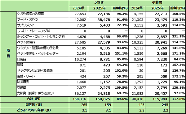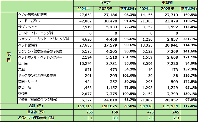 うさぎにかけた費用は150,875円(前年比89.6%)で、4種の中では最も大きく減少した。内訳としては、ペットホテル・シッター費が5,510円(前年比251.1%)と急増した一方、治療費は27,186円(前年比98.3%)でほぼ横ばいだった。