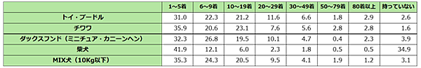 最後に、犬の洋服保有枚数を聞いたところ、いずれの犬種でも「1~5着」が最も多かった。「持っていない」と回答した割合は犬種によって違いが見られ、柴犬が34.9%と突出。トイ・プードルやチワワでは「10~19着」もやや多い傾向だった。