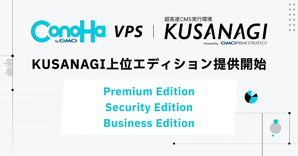 この協業によってConoHa VPS byGMOのユーザーは、従来のKUSANAGI(Free Edition)に加えて「KUSANAGI Security Edition byGMO」「KUSANAGI Premium Edition byGMO」「KUSANAGI Business Edition byGMO」の3つの上位版の利用が可能になった。Security Editionはセキュリティ運用の自動化、Premium Editionはブラウザへの画像配信・表示高速化、Business Editionはビジネスサイトの安定運用--が特長。