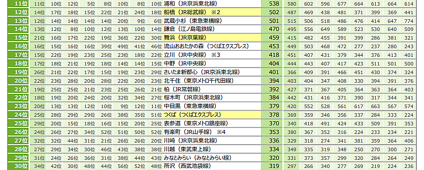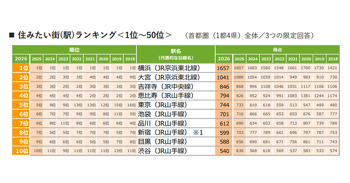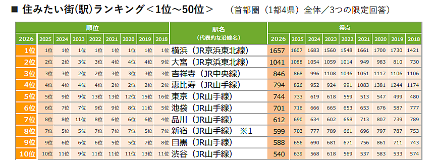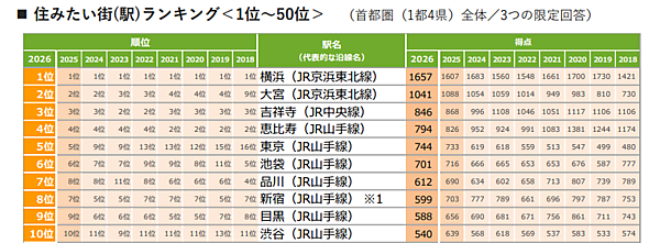 首都圏版の総合1位は9年連続で「横浜」となった。2位は「大宮」、3位は「吉祥寺」、4位は「恵比寿」と続き、上位4位までの顔ぶれは2024年から同じ結果となっている。また、7位の「品川」は前年から1ランク上昇し、「新宿」と順位を入れ替えた。「船橋」は12位、「舞浜」は15位、「つくば」は24位にランクインし、いずれも2018年以降で最高順位を更新した。