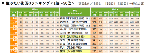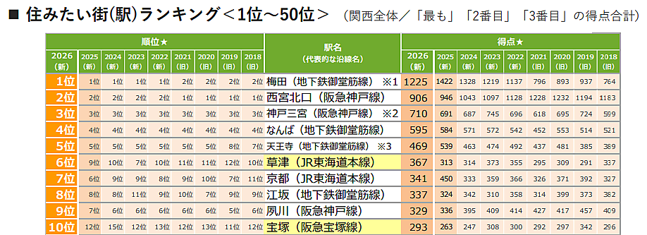 関西版の総合1位は「梅田」となった。2位は「西宮北口」、3位は「神戸三宮」、4位は「なんば」、5位は「天王寺」と続き、上位5位までは5年連続で同順位となった。また、6位の「草津」は前年から3ランク上昇し、2018年以降で最高順位を獲得。9位の「夙川」はやや順位を落とし、10位の「宝塚」は初のトップ10入りとなった。