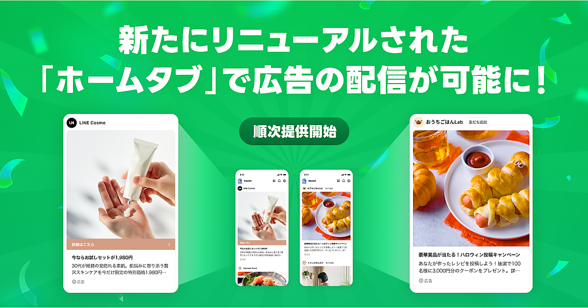 コンテンツのエリアにはユーザーの興味・関心に応じた情報が並び、インフィード型広告でユーザー体験に溶け込む自然な広告が可能。静止画、動画や、1つの広告で複数の画像・動画を表示するカルーセル広告、友だち追加広告などさまざまなフォーマットが利用できる。新ホームタブは一部ユーザーから提供して順次拡大。移行期間中は新旧ホームタブに広告が配信される。