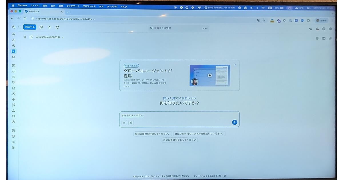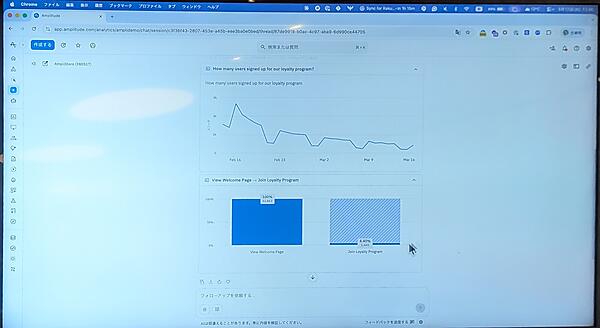 勉強会のデモでは、Amplitudeのチャット画面に「ロイヤルティプログラムの調子はどう?」と日本語で質問する様子が実演された。するとAIは即座に意図を汲み取り、加入状況のコンバージョン率や推移をチャートでビジュアライズして返答する。