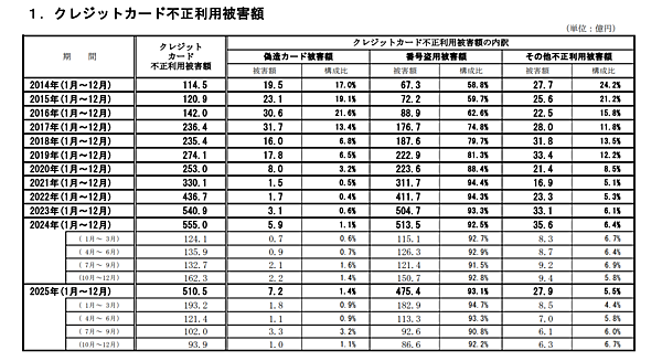 なお、2025年通年の不正利用被害額は510.5億円で、前年比8.0%減となった。内訳は、偽造被害額が7.2億円(同22.0%増)、番号盗用被害額が475.4億円(同7.4%減)、その他の不正利用被害額が27.9億円(同21.6%減)となっている。