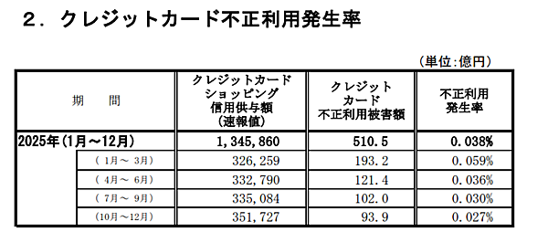 また、2025年第4四半期の不正利用発生率は0.027%となり、前期から0.003ポイントの低下。四半期別に見ると、第1四半期(1~3月)は0.059%、第2四半期(4~6月)は0.036%、第3四半期(7~9月)は0.030%で、年初から低下傾向が続いている。2025年通年の発生率は0.038%となった。