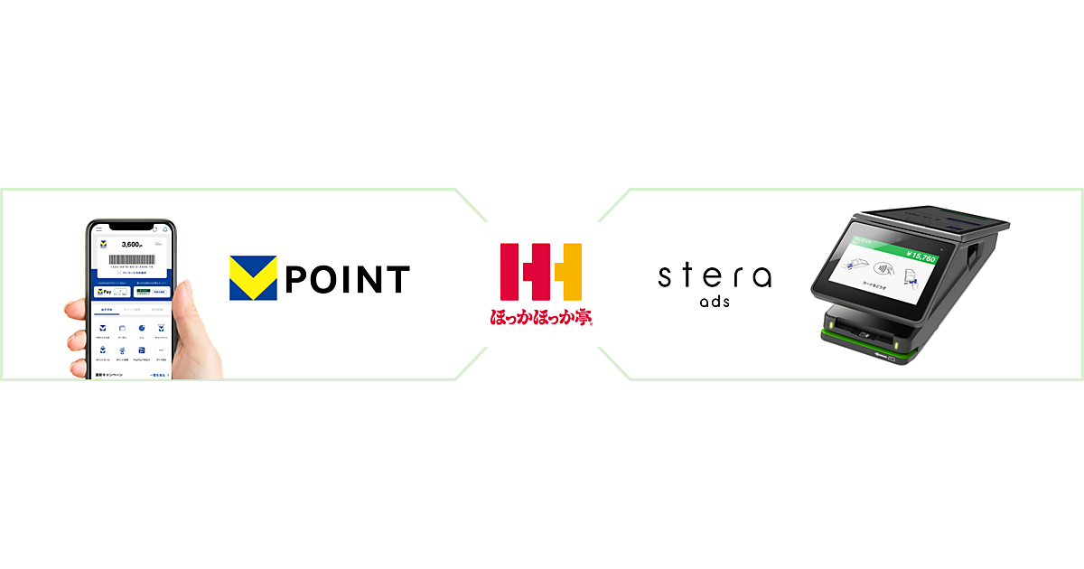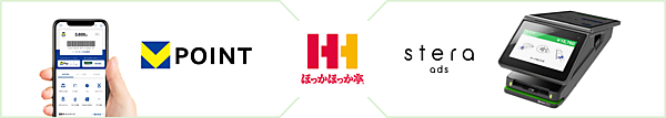 stera adsはstera terminal standardの画面を媒体に、来店客に向けて商品・キャンペーン情報を配信する広告サービス。レジで会計をする直前に情報を届け、店舗での販売促進や購買行動につなげられる。実証実験はstera adsを中心に、ほっかほっか亭が行うメーカー商品のサンプリング施策や、三井住友カードとCCMKHDの共通ポイントサービス「Vポイント」のキャンペーンを組み合わせる。