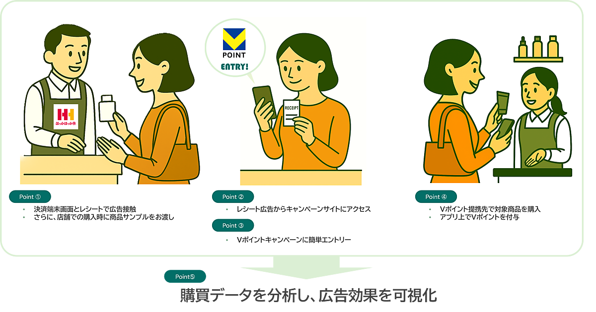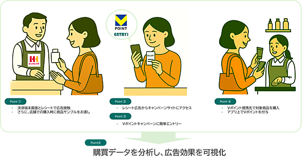 ほっかほっか亭店頭での会計時にメーカー商品のサンプルを配り、stera terminal standardの画面でその商品の広告を表示する。会計後に発行するレシートには、Vポイント提携先の小売店でその商品を購入するとVポイントが付与されるエントリーキャンペーン専用ページにアクセスできるQRコードを掲載。キャンペーン専用ページでエントリーして商品を購入すると、Vポイントが付与される。
