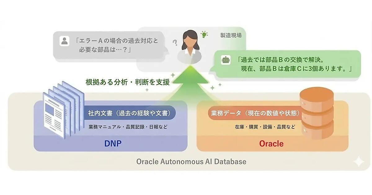 大日本印刷(DNP)は「DNPドキュメント構造化AIサービス」と日本オラクルの自律型AIデータベース「Oracle Autonomous AI Database」を組み合わせた生成AIソリューションの提供を3月23日に開始したと発表した。DNPが複雑な社内文書を生成AIが扱いやすい形に整え、Oracleが社内文書と現場の最新業務データをまとめる。部門や業務に応じたAIチャットボットやAIエージェントを提供し、サービス全体で2030年度に50億円の売上を目指す。