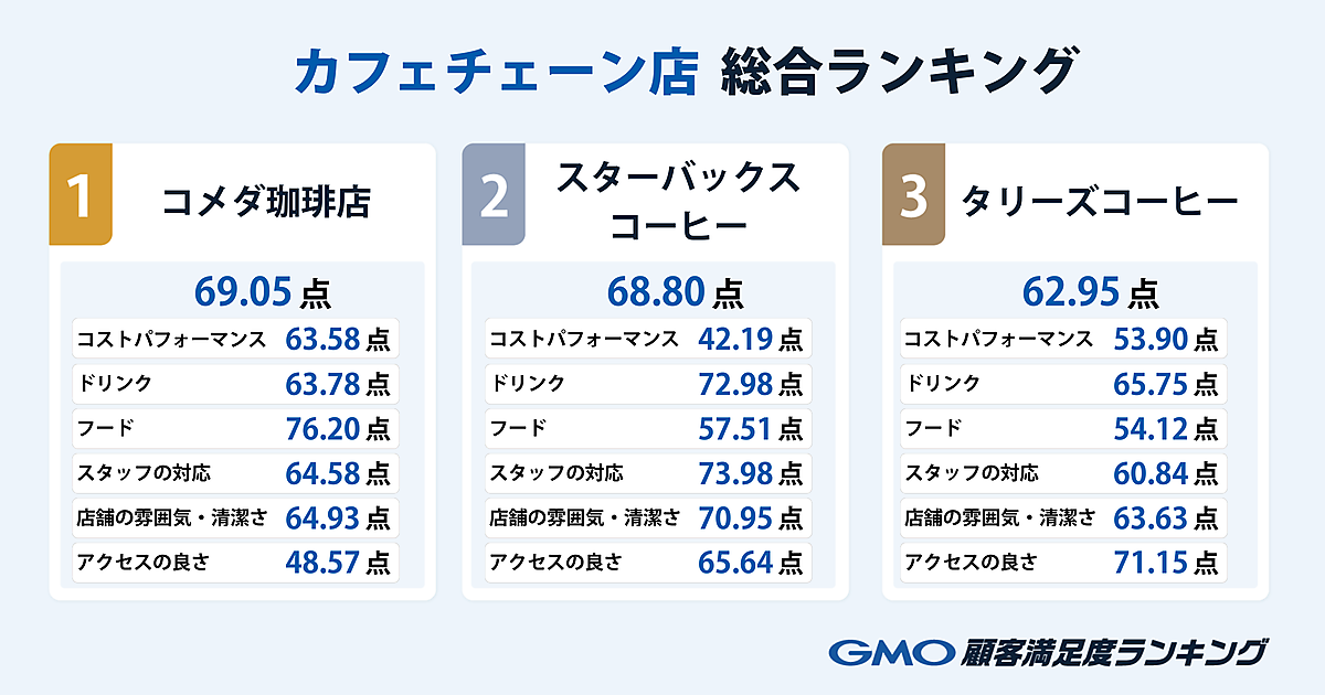 カフェ満足度ランキング、1位「コメダ」2位「スタバ」3位「タリーズ」