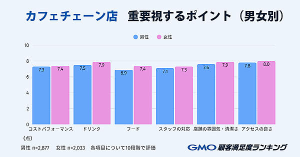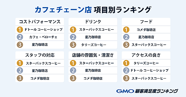 GMOリサーチ&AIは、「GMO顧客満足度ランキング」の「カフェチェーン店」部門を発表した。全国の18~84歳の5,009人が回答している。