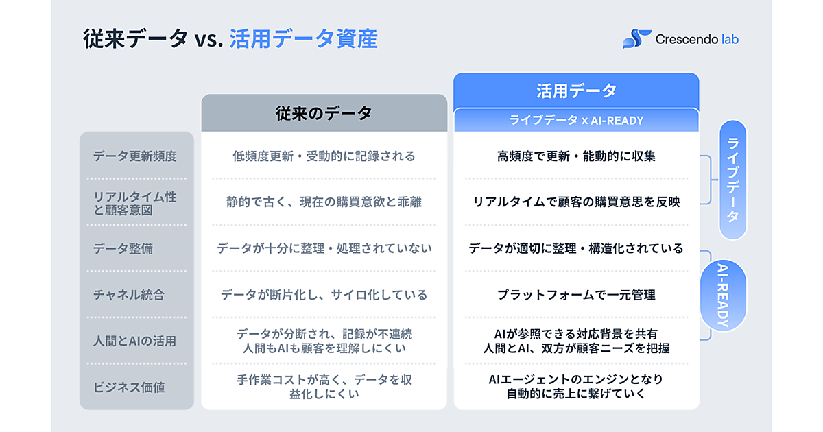 データの収集・整備・活用の3フェーズで新機能を投入する。データ収集では趣味・嗜好や来店予約データなど自社システムの情報を柔軟に取り込む「カスタム項目(Custom Field)」と、音声接客をAIが自動で要約・構造化する「CAAC音声通話&音声自動サマリー」を追加。データ整備では会話や行動履歴をAIが「興味タグ」や「購買意図シグナル」に変換して複数チャネルの顧客IDを統合する「DAAC顧客属性分析(Crescendo Audience Graph)」を導入した。