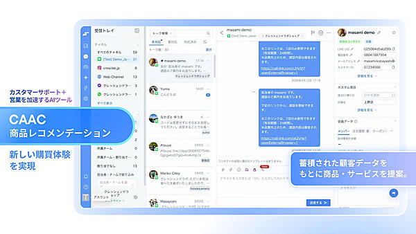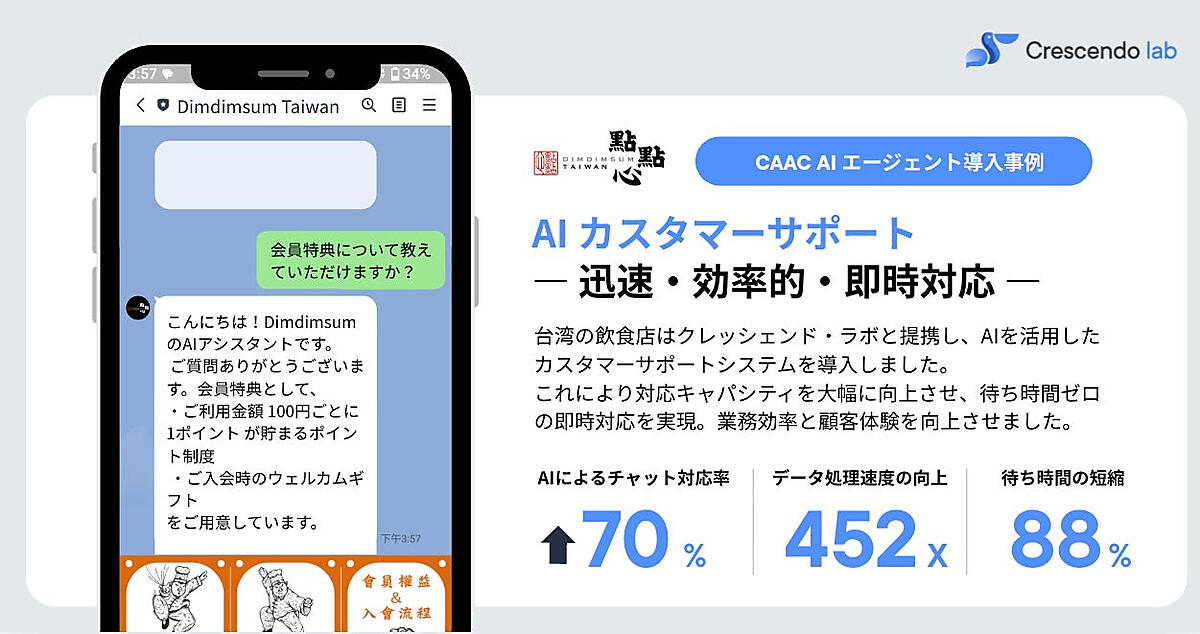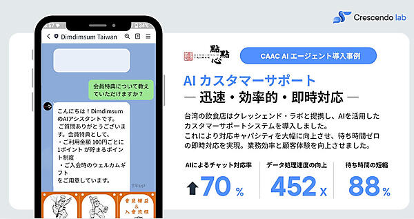 データ活用では、LINEを起点にSMS、Email、WhatsAppまでチャネルを自動選択してコンバージョン率を最大化する「MAACオムニチャネルシナリオ配信」と、蓄積プロファイルに基づきAIが会話中に最適商品を提案する「CAAC商品レコメンデーション」をリリース。導入事例では台湾の飲食チェーン「點點心(DimDimSum)」で、問い合わせの約70%を自動対応し、応答スピードを452倍に改善して顧客の待ち時間を88%短縮した実績がある。