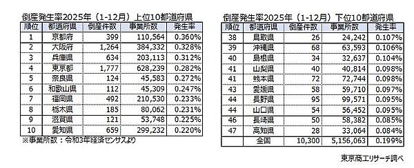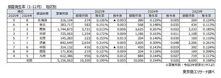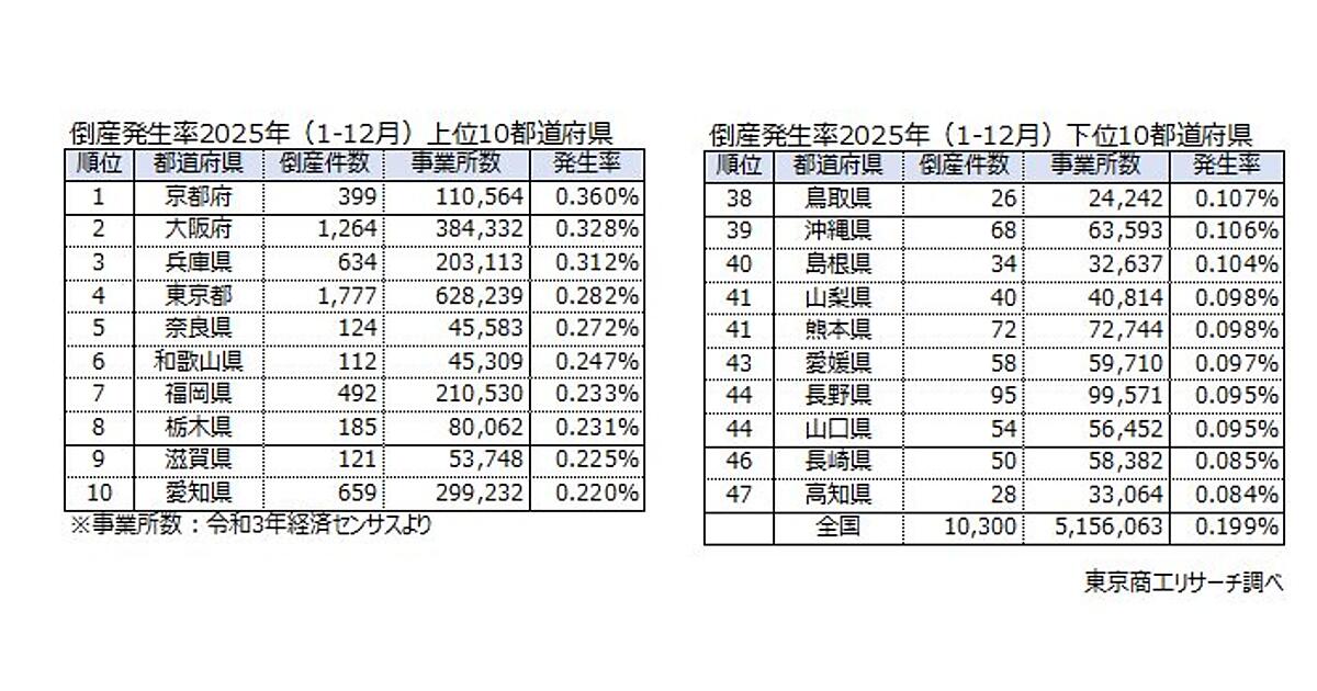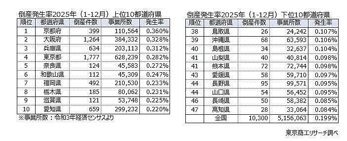 東京商工リサーチは、「2025年の全国企業倒産」に関する調査結果を発表した。「2021年経済センサス」(総務省)の515万6063事業所と都道府県別の倒産件数から「倒産発生率」を算出している。