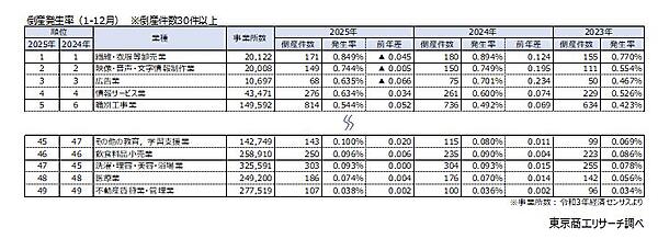 業種別(倒産30件以上)で見ると、アパレル業「繊維・衣服等卸売業」0.84%が最多で、「映像・音声・文字情報制作業」0.74%、「広告業」0.635%、「情報サービス業」0.634%、「職別工事業」0.54%が続く。ワースト1位から4位は前年と順位が変わらなかった。企業倒産は2022年から4年連続で増勢を持続し、今後は中小企業の設備投資だけでなく、住宅ローン上昇の影響も懸念されている。一方もっとも低いのは「不動産賃貸業・管理業」の0.03%だった。