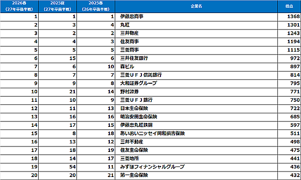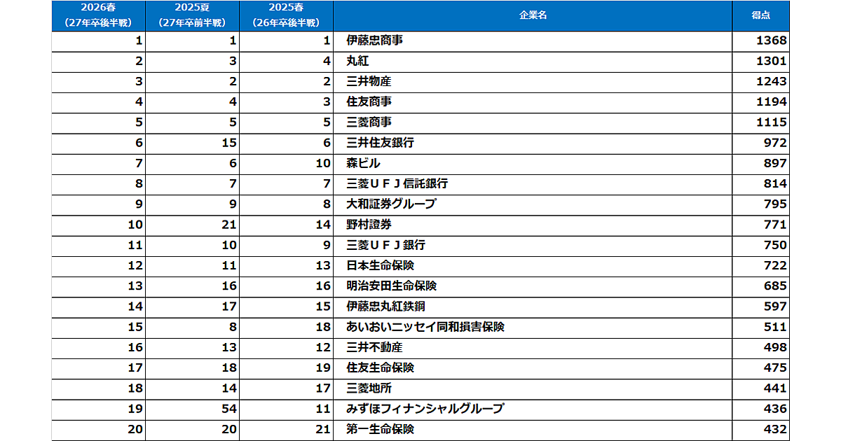 男子は「伊藤忠商事」「三井物産」など総合商社がトップ5独占