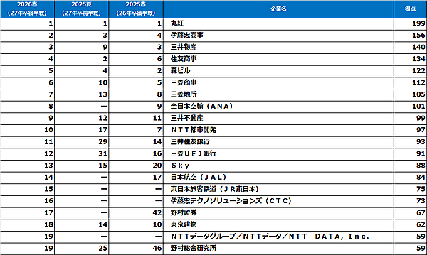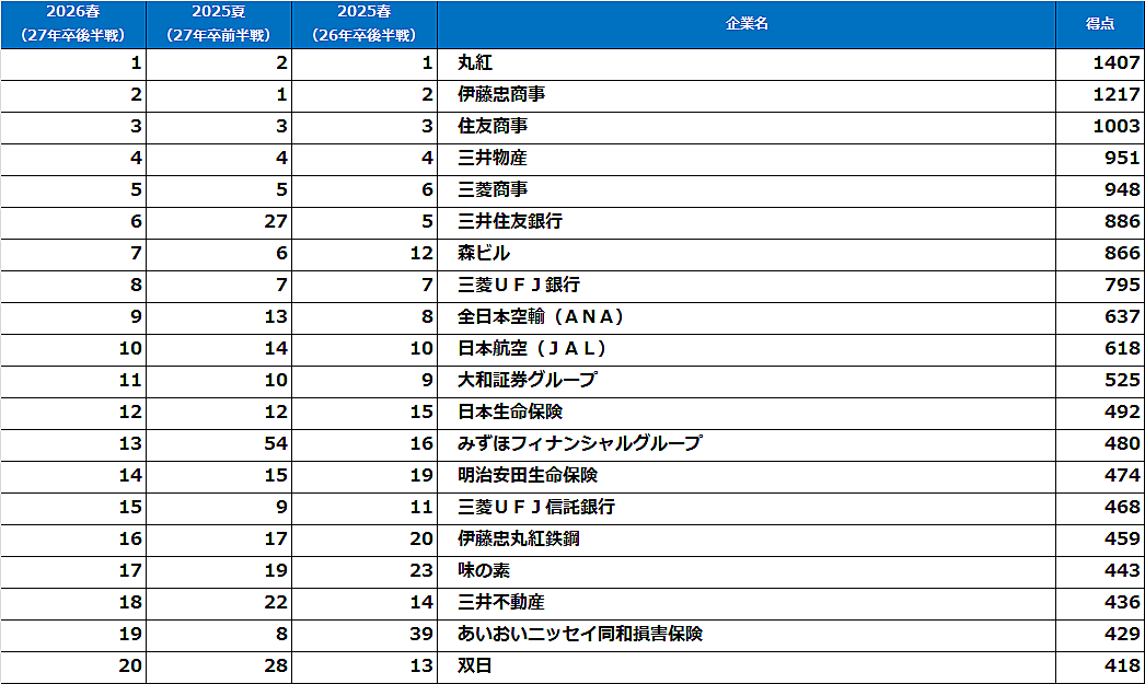 文系女子では、「丸紅」が2年連続で1位を獲得。男子と同様に総合商社がトップ5を占め、根強い人気を示した。さらに、「三井住友銀行」「三菱UFJ銀行」といった大手金融機関に加え、「全日本空輸(ANA)」「日本航空(JAL)」などの航空業界もランクイン。安定して働き続けられる環境や充実した制度面が支持を集めている。