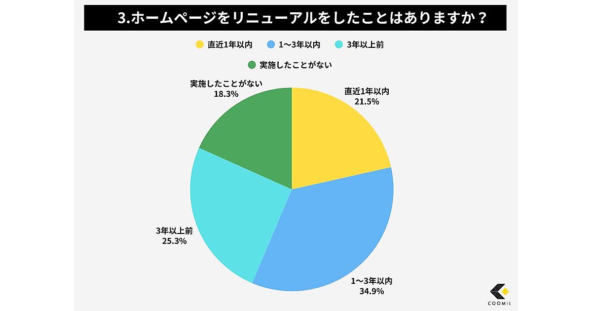 まず「ホームページのリニューアル実施の有無」を聞くと、「直近1年以内」21.5%、「1~3年以内」34.9%、「3年以上前」25.3%、「実施したことがない」18.3%で過半数の企業が直近3年以内にリニューアルを実施していた。