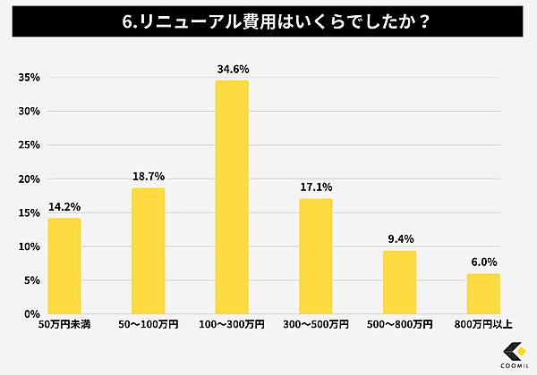 「リニューアル費用」については「100~300万円」34.6%が最多で、「50~100万円」18.7%、「300~500万円」17.1%がそれに続く。