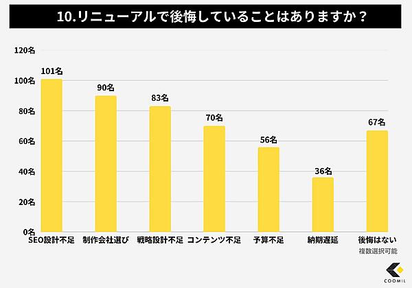 最後に「現在のホームページの課題」を聞くと、「問い合わせが増えない」122人、「SEO順位が上がらない」114人、「採用応募が少ない」104人などが上位。さらに「リニューアル後の後悔」について聞くと、「SEO設計不足」101人、「制作会社選び」90人、「戦略設計不足」83人などが上位だった。リニューアルのきっかけとなった「デザイン老朽化」にはある程度対処できたものの、「問い合わせ減少」「採用応募不足」といった課題は、リニューアルを経ても抱えたままという企業が多いようだ。
