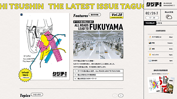 『タグチ通信』は、タグチグループが発行する2015年9月創刊の社内報。社員の家族や知人も楽しめる内容づくりや、企業情報を親しみやすく伝える工夫が魅力。