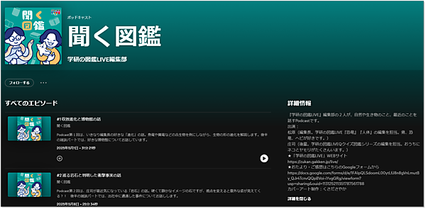 「聞く図鑑」は、『学研の図鑑LIVE』編集部が運営する、自然や生き物の魅力を音声で伝えるポッドキャスト番組。編集者視点で、さまざまな図鑑の楽しさを発信している。