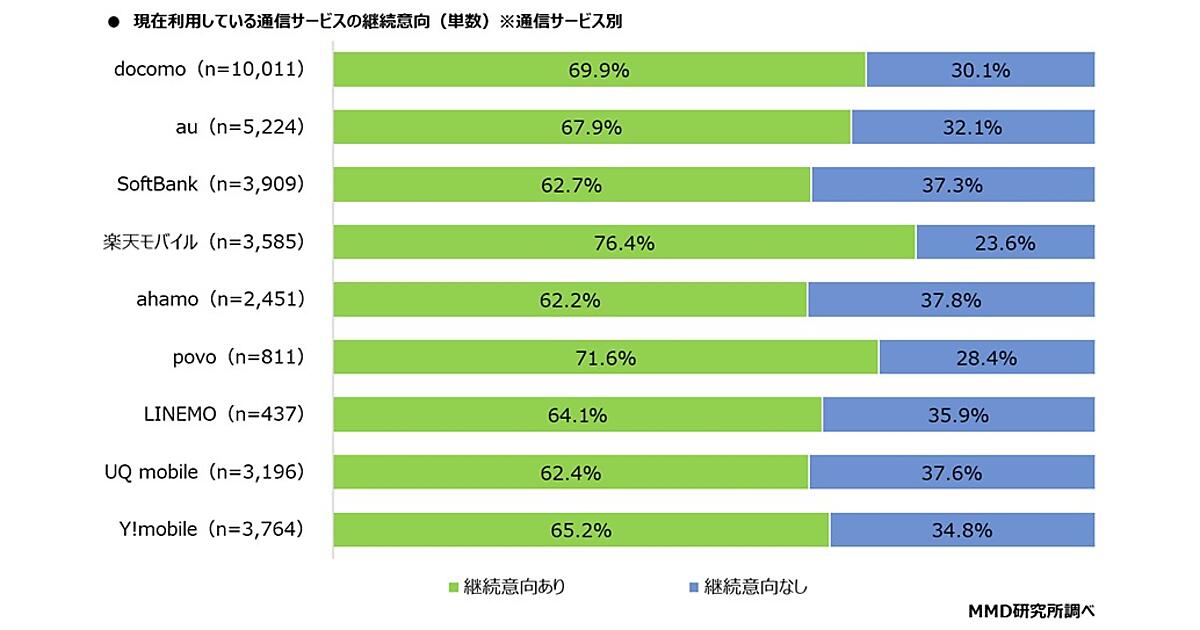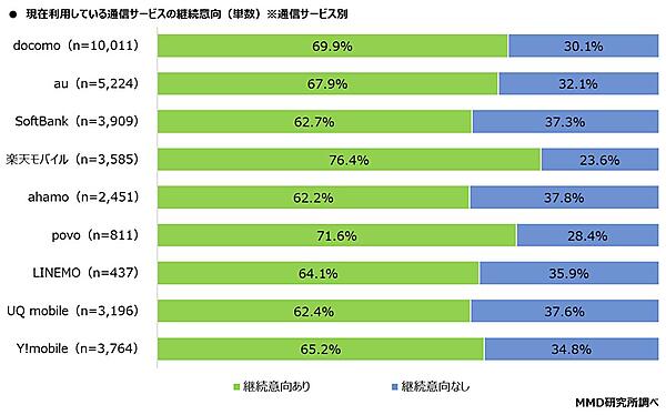 通信契約しているスマートフォンを所有している36,661人に「現在利用している通信サービスの継続意向」を聞くと、「継続意向あり」68.0%、「継続意向なし」32.0%だった。通信サービス別では、もっとも継続意向が高いのは「楽天モバイル」76.4%、もっとも継続意向が低いのは「ahamo」62.2%だった。