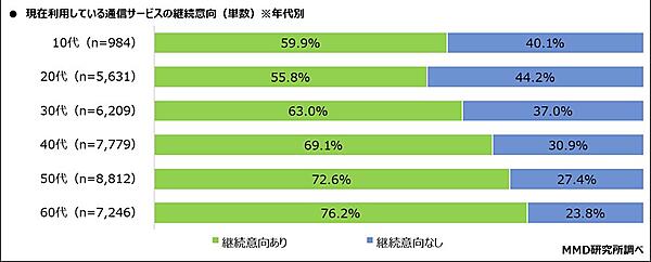年代別だと、もっとも継続意向が高いのは「60代」76.2%、もっとも継続意向が低いのは「20代」55.8%となっている。