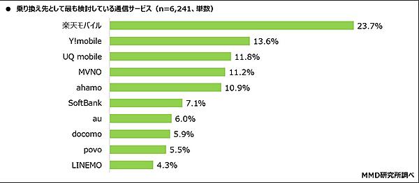 現在利用している通信サービスから他の通信サービスへ具体的な乗り換え先を検討している6241人に「乗り換え先としてもっとも検討している通信サービス(自社系列の乗り換えも含む)」を聞くと、「楽天モバイル」23.7%、「Y!mobile」13.6%、「UQ mobile」11.8%が上位。2025年2月の調査と比較すると、「au」が1.4ptともっとも増加しており、次いで「MVNO」が0.9pt、「povo」が0.2pt増加している。