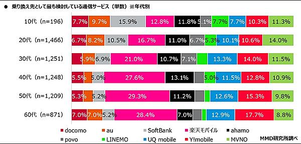 また年代別でもっとも検討している通信サービスを見ると、10代は「SoftBank」、20代・30代・40代・50代・60代は「楽天モバイル」がそれぞれ1位だった。