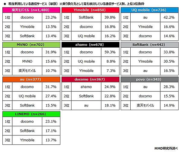 乗り換え先の通信サービス別で「現在利用している通信サービス」の順位を見ると、楽天モバイル・MVNO・ahamo・SoftBank・au・LINEMOのユーザーは「docomo」が1位。Y!mobileユーザーは「SoftBank」が、UQ mobile・povoユーザーは「au」、docomoユーザーは「ahamo」がそれぞれ1位で、現在利用している会社の系列ブランドに乗り換える意向が見られた。