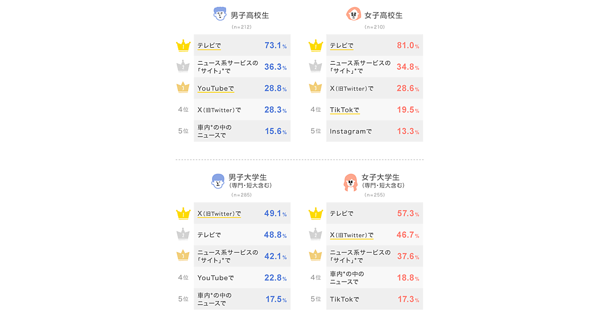 ニュースを見聞きする方法や場所を聞くと、高校生では男女ともに「テレビ」が7割~8割で1位となった。2位は「ニュース系サービスのサイト」が3割台半ばで続いている。一方で、大学生では「テレビ」と「X(旧Twitter)」との差が比較的小さく、特に男子大学生では「X(旧Twitter)」が約5割でトップとなった。