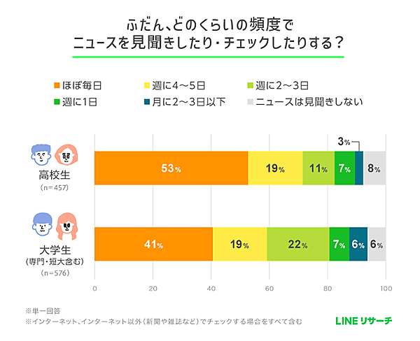 まず、普段どのくらいの頻度でニュースをチェックしているかを聞くと、高校生・大学生ともに「ほぼ毎日」が最多だった。特に高校生は5割強、大学生も約4割にのぼり、「ニュースは見聞きしない」という層は少数派であることがわかった。
