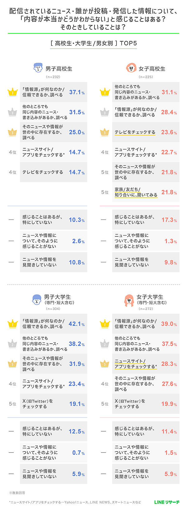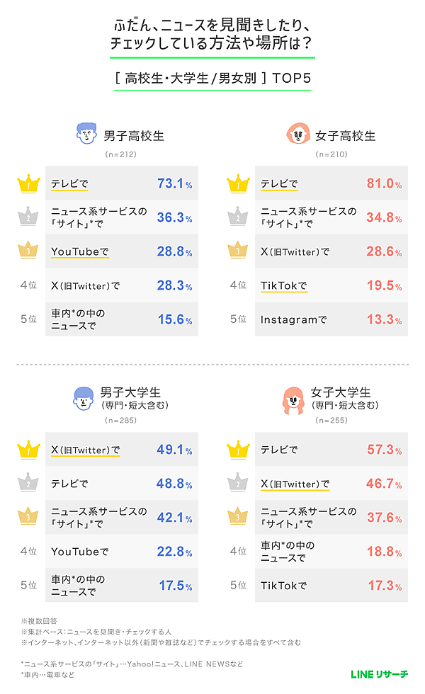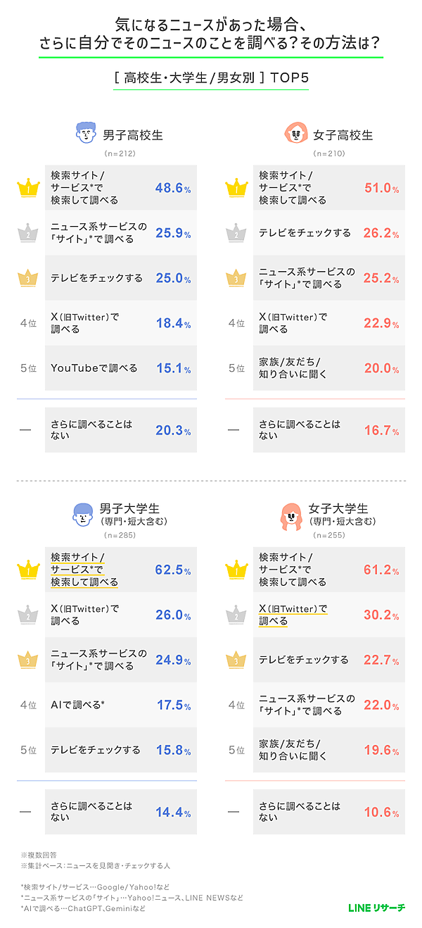 高校生では、これに続いて「テレビをチェックする」「ニュース系サービスのサイト(Yahoo!ニュース、LINE NEWSなど)で調べる」が上位に。一方で、大学生では男女ともに「X(旧Twitter)で調べる」が2位となり、男子大学生では「AIで調べる」も4位にランクインした。