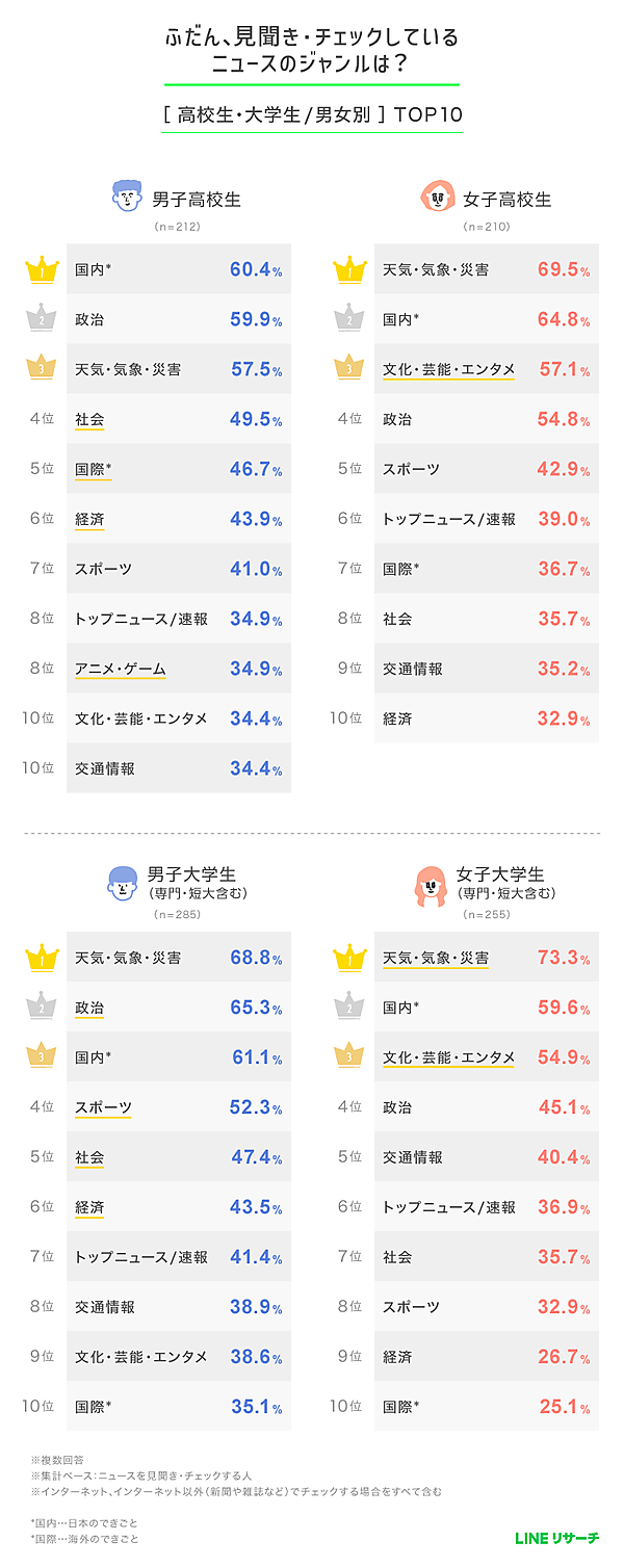 チェックしているニュースのジャンルでは、高校生・大学生ともに「天気・気象・災害」が最多に。「国内(日本のできごと)」も上位に入っており、男子高校生では首位を獲得している。男女別にみると、男子は「政治」や「スポーツ」、女子は「文化・芸能・エンタメ」への関心が高い傾向が見られた。