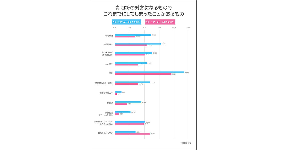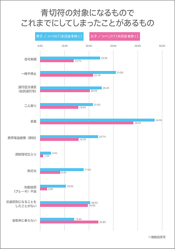 青切符の対象となる行為のうち、これまでにしたことがあるものを聞いたところ、男女ともに最も多かったのは「並走(横に並んで走行する)」で、男子が46.9%、女子が38.2%にのぼった。以下、「一時不停止」「通行区分違反(右側通行等)」などが続き、日常的な自転車の乗り方を見直す余地があることがうかがえる。なお、「交通反則になることをしたことがない」「自転車に乗らない」と答えた層も一定数存在した。