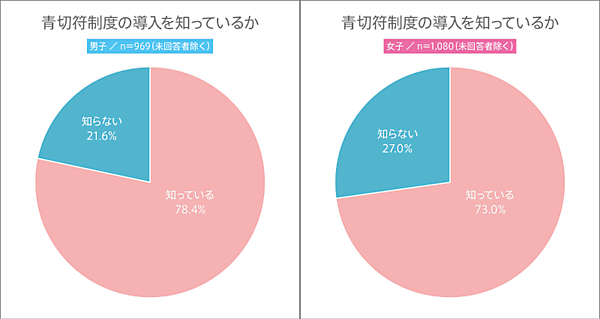 まず、4月1日から適用される自転車の交通反則通告制度、いわゆる「青切符制度」の認知度を聞くと、男子高校生は78.4%、女子高校生は73.0%が「知っている」と回答した。
