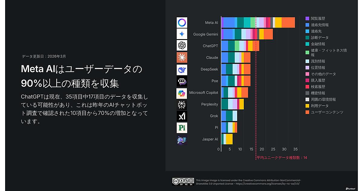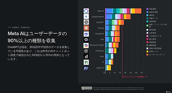 調査によると、主要なAIチャットボットアプリが収集しているデータの種類は、最大35項目中平均14項目となった。位置情報を収集するアプリの割合は前年の40%から70%へ増加しており、検索履歴や音声データ、健康・フィットネス情報などを含め、取得範囲が広がっていることがわかった。以下、収集データの種類が多かった上位3つを紹介する。
