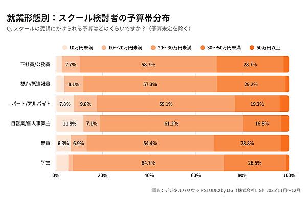 まず「スクールの受講にかけられる予算」を聞くと、「20~30万円未満」34.5%が最多ながら、「予算未定」33.7%がほぼそれに並ぶ。以下「30~50万円未満」17.7%、「10~20万円未満」5.1%が続いた。