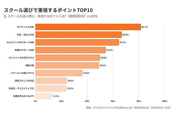 「スクール選びで重視するポイント」については、「カリキュラム内容」81.7%が最多で、「料金・支払い方法」66.7%、「スキルアップのサポート体制」64.7%がそれに続いた。