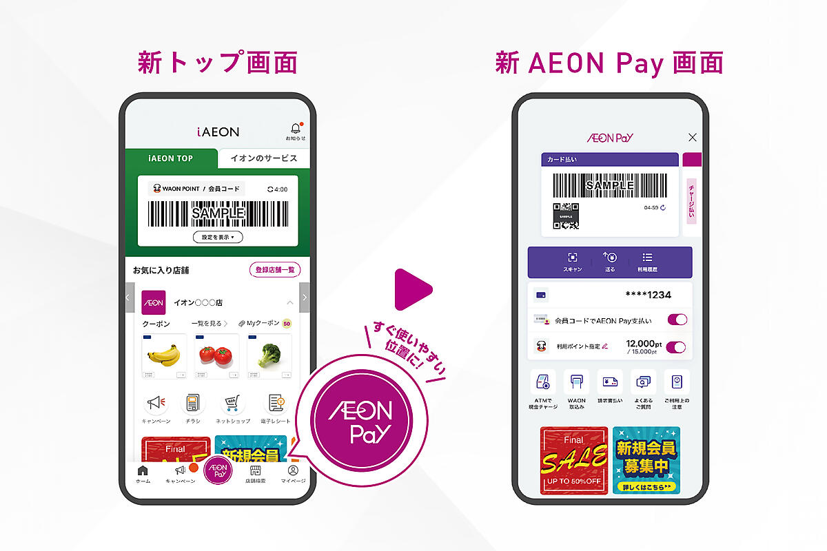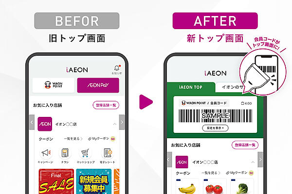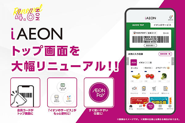 イオンは、トータルアプリ「iAEON(アイイオン)」のデザインを大幅に刷新したと4月6日に発表した。アプリを開いたトップ画面に会員コードを表示し、QRコード・バーコード決済の「AEON Pay」の配置を見直して買い物時の操作性を全面的に改善した。イオン傘下で情報システムサービスのイオンスマートテクノロジーが明らかにした。